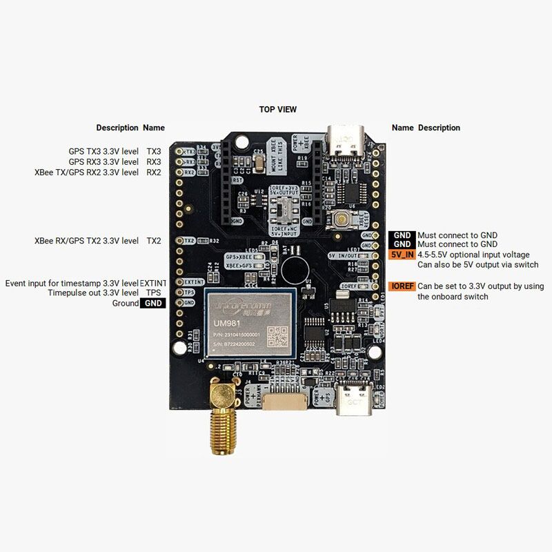 - TX2: Unicore COM2 TX (tämä nasta on myös kytketty XBee UART RX:ään)